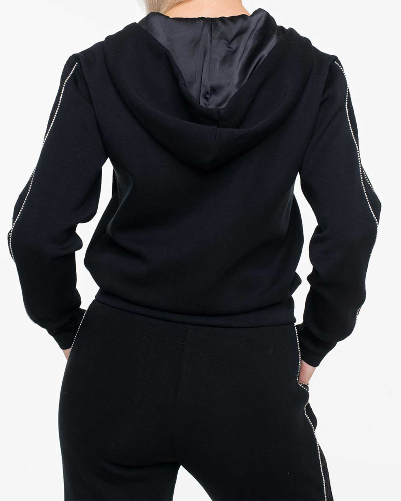 Features a lace strip with strass on the sleeves