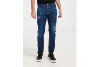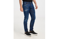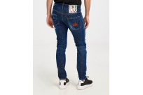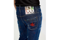 Dsquared2 Blue Dark Bob Wash Button Up Jeans With Patches And Splashes, Two Pockets And Side Pocket, Two Back Pockets, Right Back Embroidered Logo And Bob Marley Portrait Design On The Back zone. Skater jeans.
